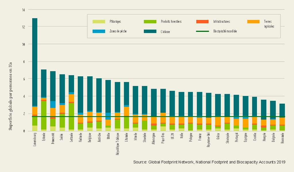 Cela signifie que si toute l’humanité consommait autant de ressources que les Européens; elle utiliserait l’équivalent de 2,8 planètes Terre pour subvenir à ses besoins. Un résultat bien au-dessus de la moyenne mondiale qui se situe autour de 1,7 Terre. En effet, alors que la population de l’Union européenne ne représente que 7 % de la population mondiale; les Européens utilisent à eux seuls 20 % de la biocapacité de la Terre.